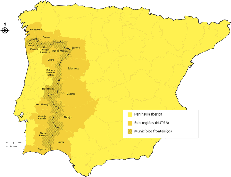 Do lado Espanhol, abrange os municípios das províncias fronteiriças de: Badajoz; Cáceres, Ourense, Pontevedra, Salamanca e Zamora – um total de 1.231 municípios, 86.561 km2 e 3.342.554 habitantes.